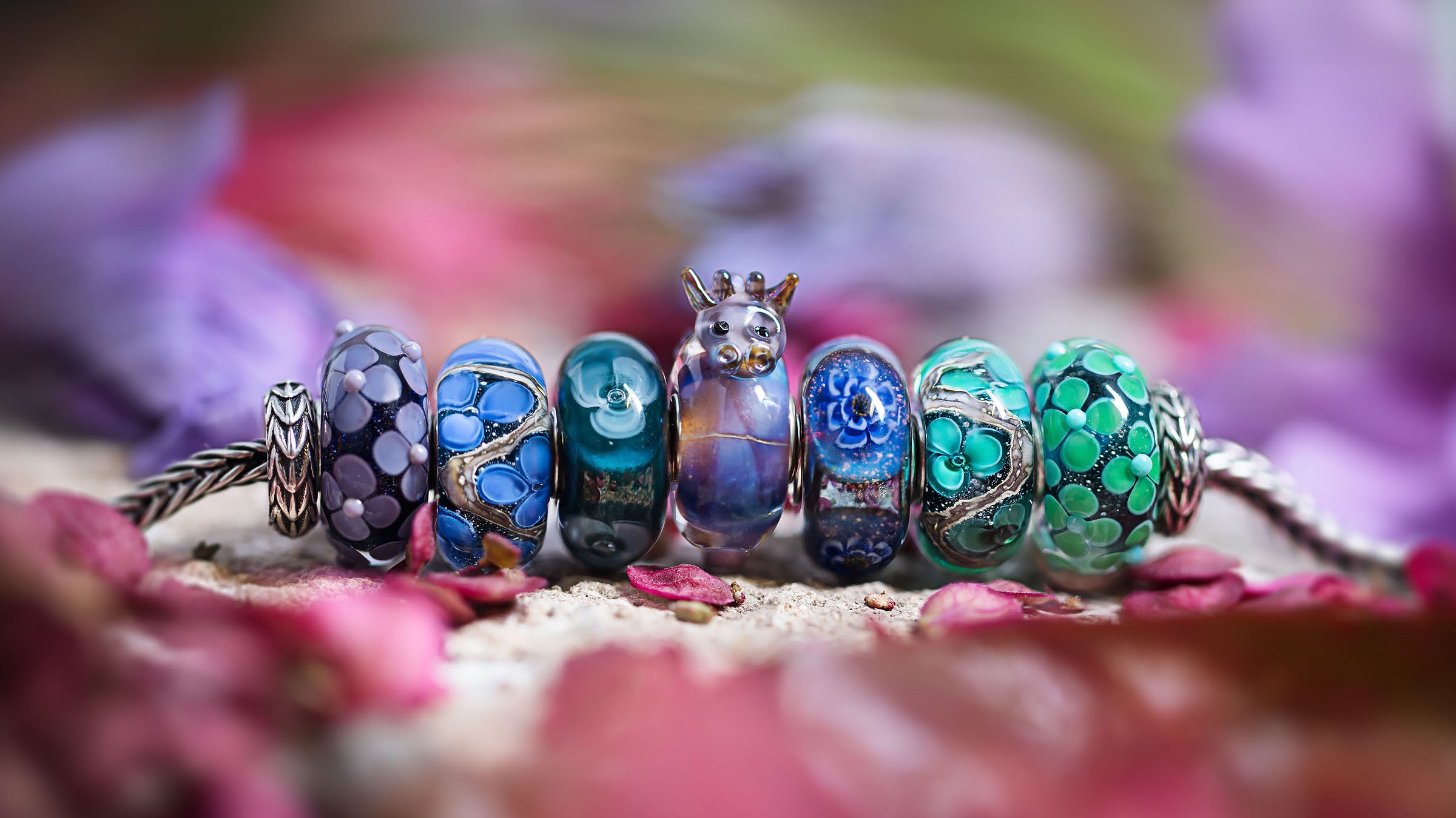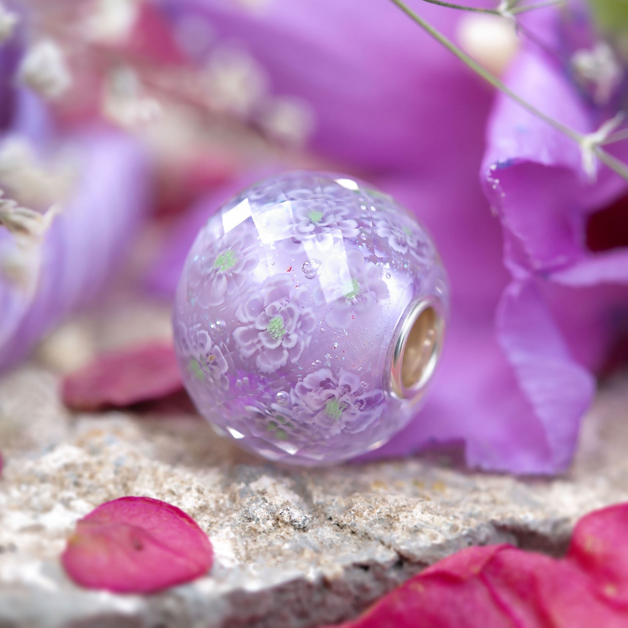 This round faceted glass bead plays with the light beautifully and features numerous small ruffled flowers consisting of a Darker Lavender base with Crisp White outer edges for added depth and dimension. The flower center is a bright Celadon Green. These flowers float over a shimmery base of the palest Lavender that also flashes lighter Sky Blue as the bead catches the light.
