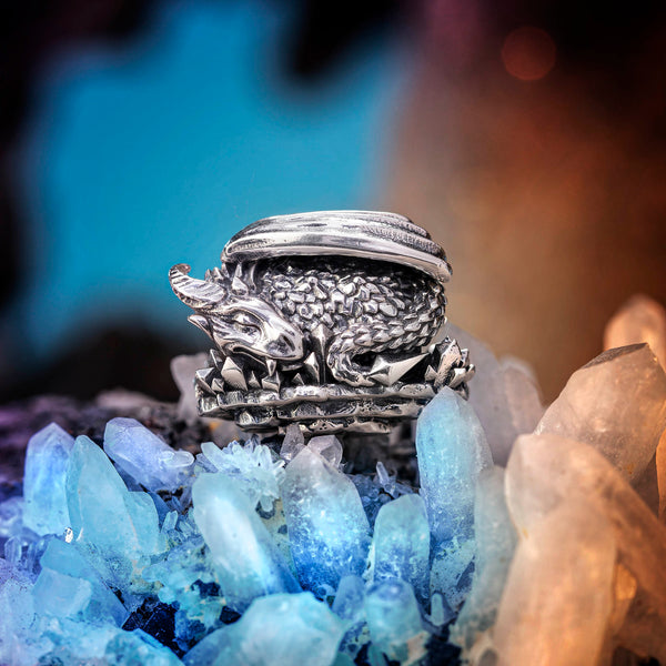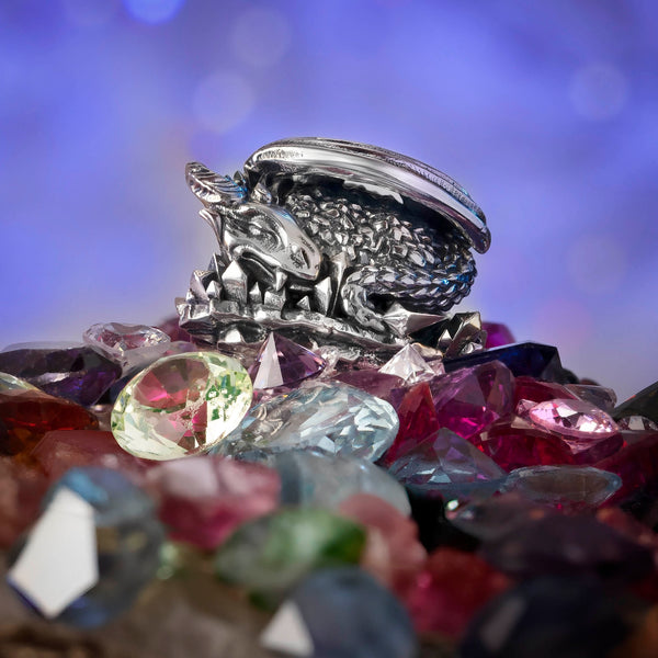 In this stillness, the dragon teaches us that true power lies not in motion, but in presence. Curled upon a solid rock, it becomes one with the earth, grounded, watchful, at peace. All around, crystals rise like silent flames, recharging and healing its spirit with their quiet glow.